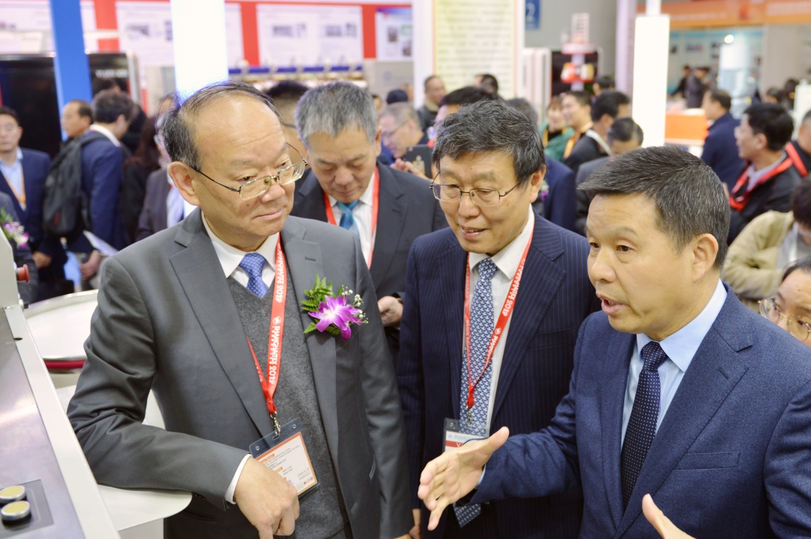 沈方勇董事長在2019年上海國際紡機展上,向中國紡聯(lián)黨委書記兼秘書長高勇等領(lǐng)導(dǎo)介紹天門紡機新產(chǎn)品開發(fā)情況