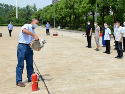 楊吉學(xué)在公司組織的消防演練中示范消防器材正確使用方式