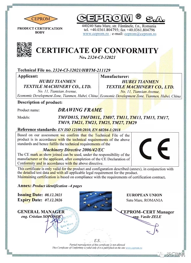 天門紡機(jī)作為擁有歐盟“CE”認(rèn)證證書的高新技術(shù)企業(yè),一直以優(yōu)良的產(chǎn)品質(zhì)量、過硬的質(zhì)控體系以及全球化視野,積極參與國(guó)際競(jìng)爭(zhēng),并條機(jī)具有進(jìn)入歐盟市場(chǎng)的準(zhǔn)入資格,有力助推了海外市場(chǎng)新增長(zhǎng)。