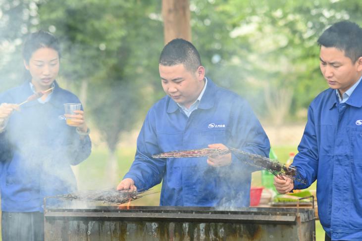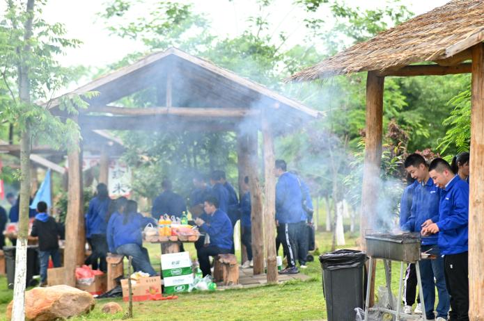 帶著依依不舍的心情,青年員工們告別張家湖國(guó)家濕地公園,來(lái)到皂市長(zhǎng)壽村原村。這是一座位于皂市鎮(zhèn)境內(nèi)的農(nóng)家樂(lè),田園氣息濃烈,采摘和燒烤樂(lè)趣無(wú)窮,大家直奔燒烤專區(qū)。幾名青年員工已提前將炊具、餐具和食材運(yùn)送到目的地,大家不顧疲憊,開(kāi)始分配工作,我是“支賓先生”,你是“炊事員”,她是“勤雜員”。一會(huì)兒后,炊煙升起,香氣四溢,有燒烤和火鍋的香辣味,有菠蘿的香甜味,有主食的香糯味,更有青年朋友們團(tuán)結(jié)協(xié)作的歡聲笑語(yǔ)。