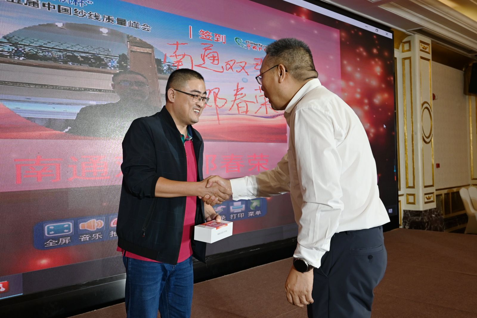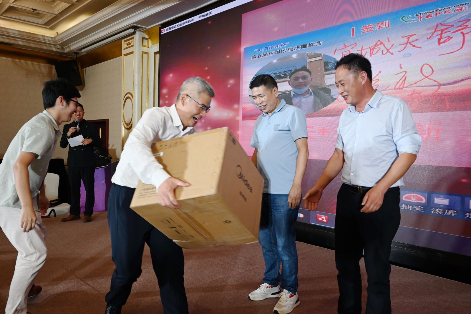 △天門紡機(jī)市場(chǎng)總監(jiān)周志宏、天門紡機(jī)副總經(jīng)理肖少華為抽獎(jiǎng)環(huán)節(jié)獲獎(jiǎng)代表頒獎(jiǎng)