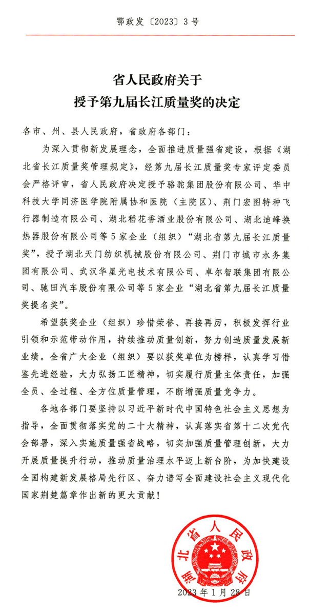 近日,湖北省人民政府以鄂政發(fā)(2023)3號(hào)文頒發(fā)《關(guān)于授予第九屆長(zhǎng)江質(zhì)量獎(jiǎng)的決定》。天門紡機(jī)榮獲“湖北省第九屆長(zhǎng)江質(zhì)量獎(jiǎng)提名獎(jiǎng)”,受到省政府表彰。