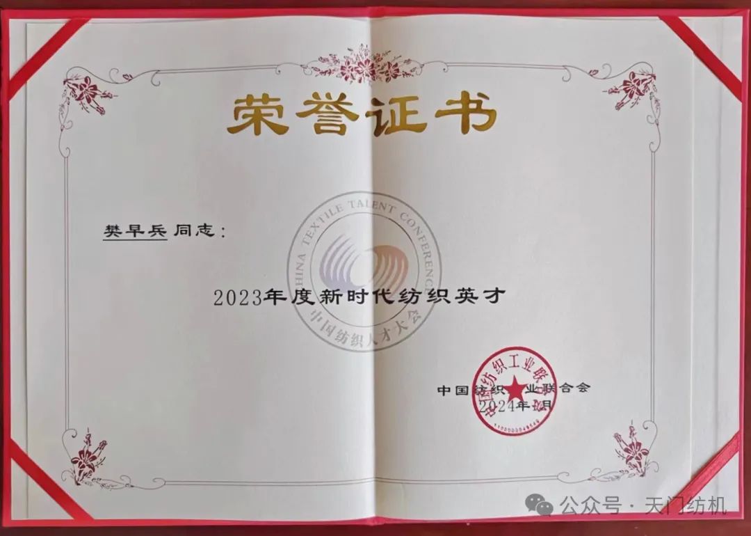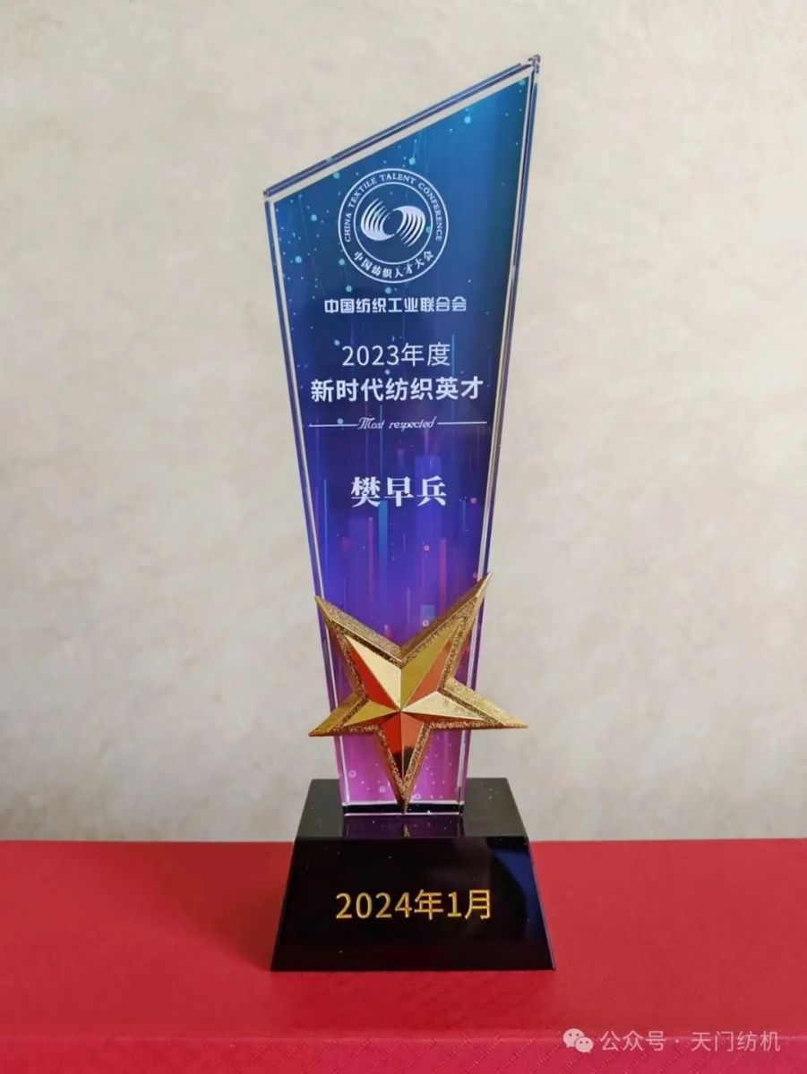 2024年1月16日,樊早兵同志在全國人大會議中心參加“2023年中國紡織人才大會”,受到中紡聯(lián)表彰,獲得“2023年度新時代紡織英才”獎牌和榮譽(yù)證書。