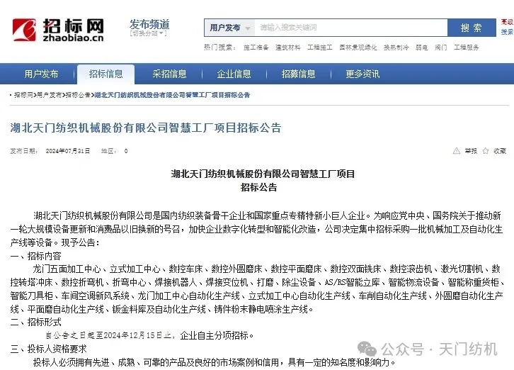 近日,天門紡機(jī)對外發(fā)布設(shè)備招標(biāo)公告,正式啟動“智慧工廠”項目新一輪設(shè)備采購計劃。